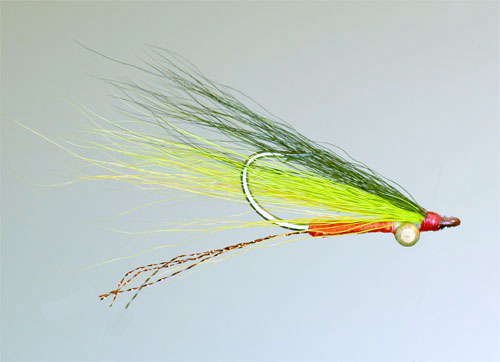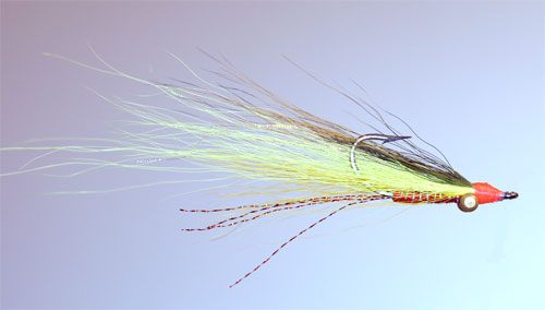 1) Tie in the Dumbbell eyes behind the eye leaving room for the head. 2) Tie in 4 strands of crystal flash for the tail above the hook barb. 3) Dress the hook shank with a few layers of red floss and paint on a few layers of Sally Hanson's. 4) When this has dried. Reverse the hook in the jaws and tie in a small bunch of yellow buck tail in front of the eyes. At this point a few strands of flash can be added. 5) Tie in a small bunch of Chartreuse buck tail on top of the Yellow and an even smaller bunch of a dark coloured buck tail to complete the wing. 6) Finish off the head with red or chartreuse thread and apply your favourite head cement. |